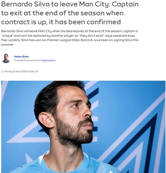 天空体育消息,曼城队长贝尔纳多-席尔瓦将在本赛季结束后离队,这名31岁的球星在效力曼城9年间已经随队赢得过6个英超冠军以及1个欧冠冠军,但他将在本赛季结束合同到期后自由转会。